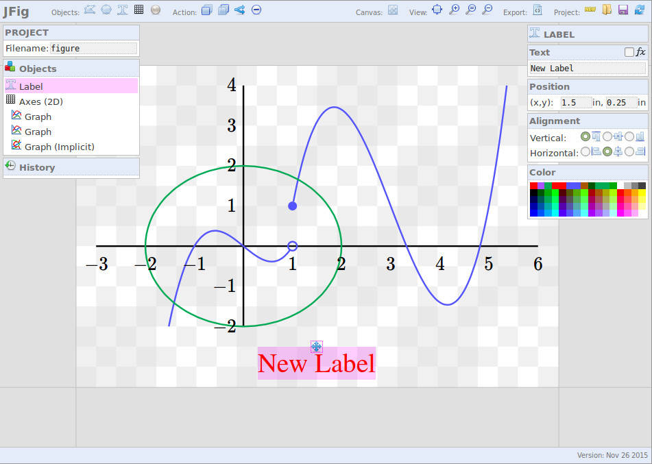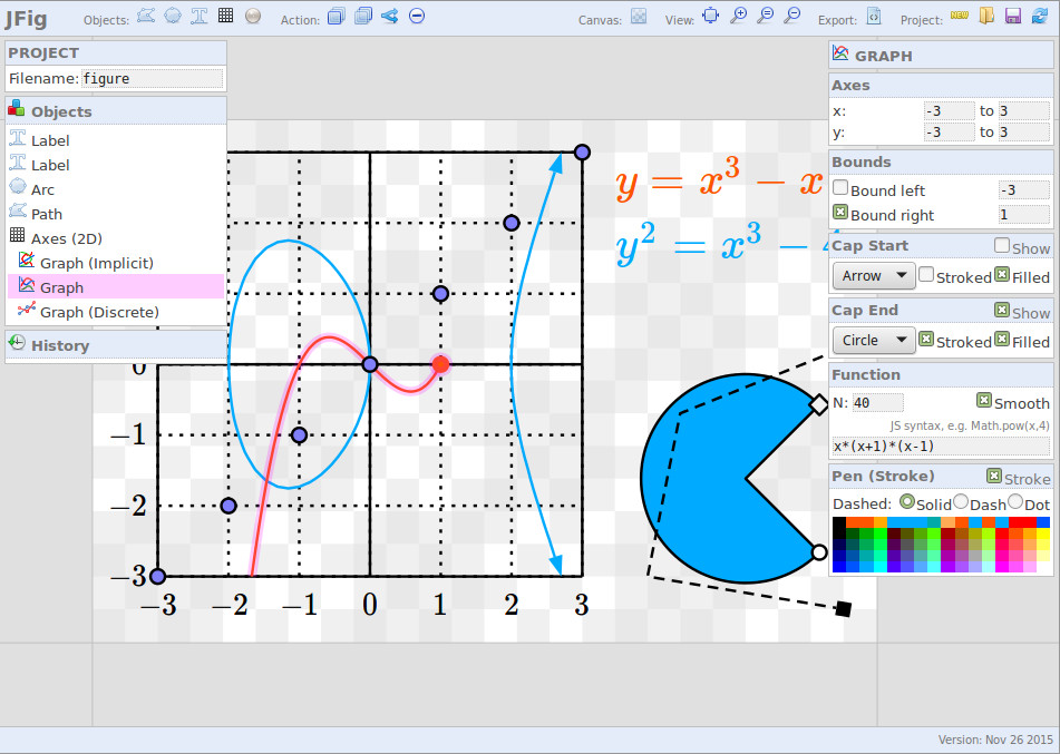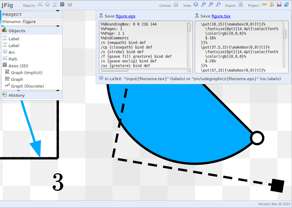 A vector graphics editor written in JavaScript which outputs EPS/LaTeX. The purpose is to make it very quick and easy to put together a simple mathematical figure that will look exactly as intended in a PDF. Figures can be saved and loaded for later editing. I haven't written any instructions yet, but I think it should be pretty easy to use.