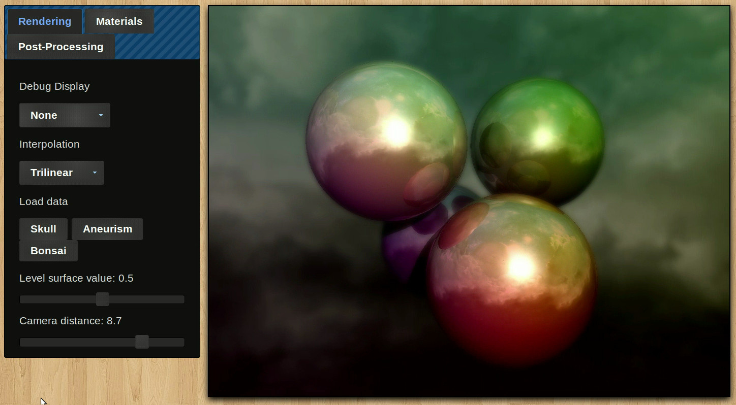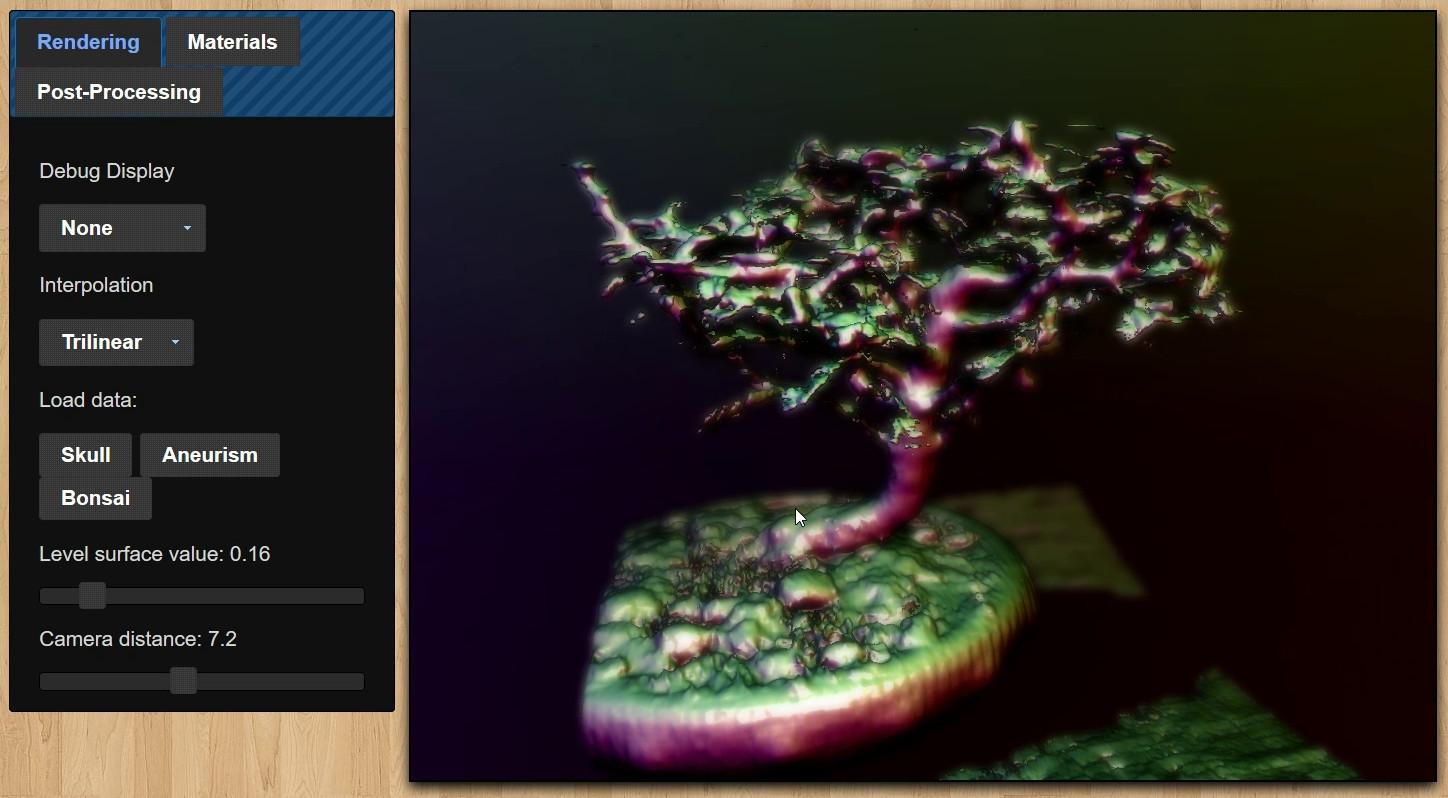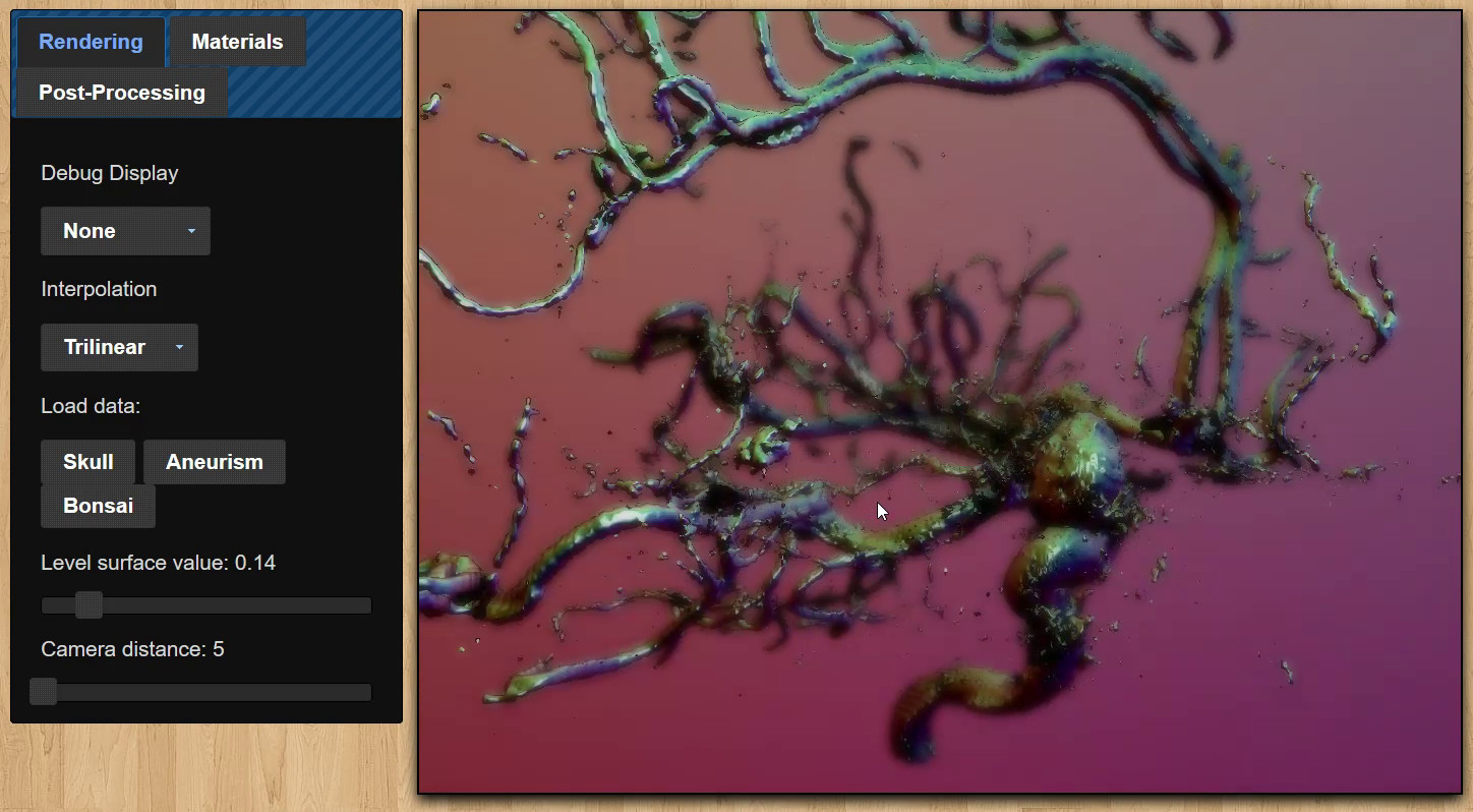 A little experiment that essentially raytraces a level set given a 3D texture (the slices of which are arranged in a grid on a 2D texture). Data can either be loaded from a resource or it can be generated and animated on the fly. Trilinear interpolation is optionally used to smooth the surface, and an octree is dynamically generated to speed up the raytracing. All of the data is stored in textures and all of the work is done by fragment shaders.