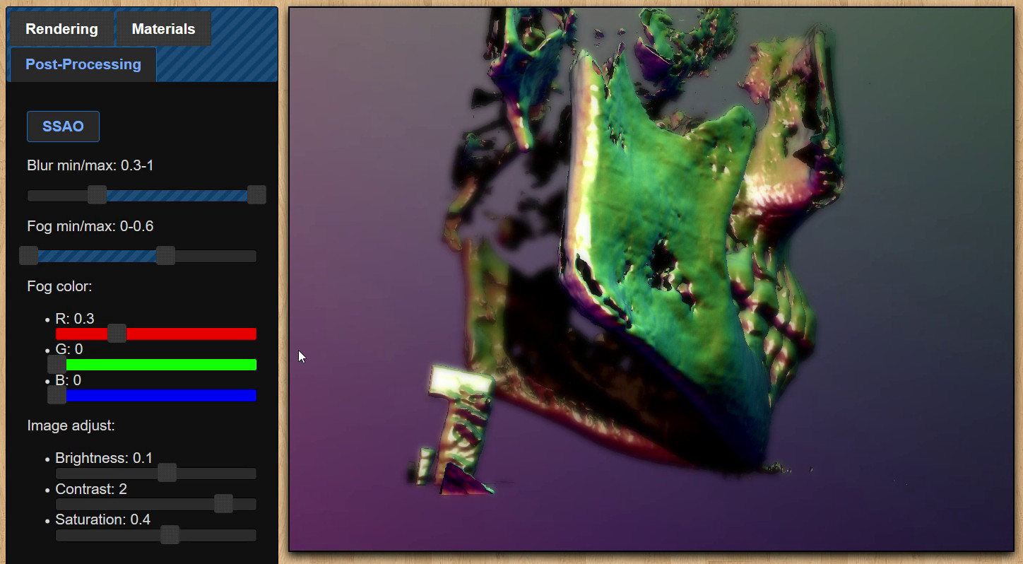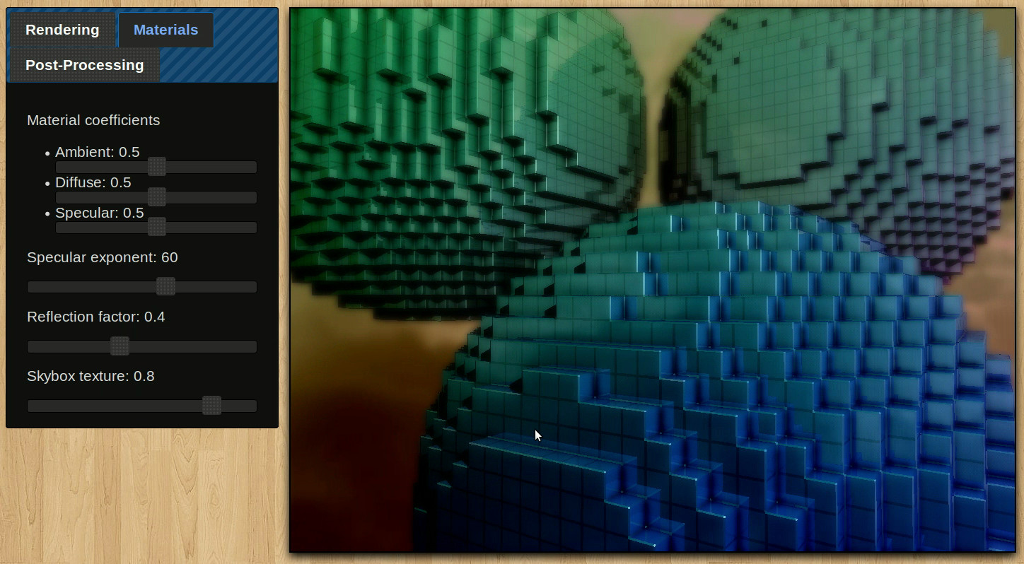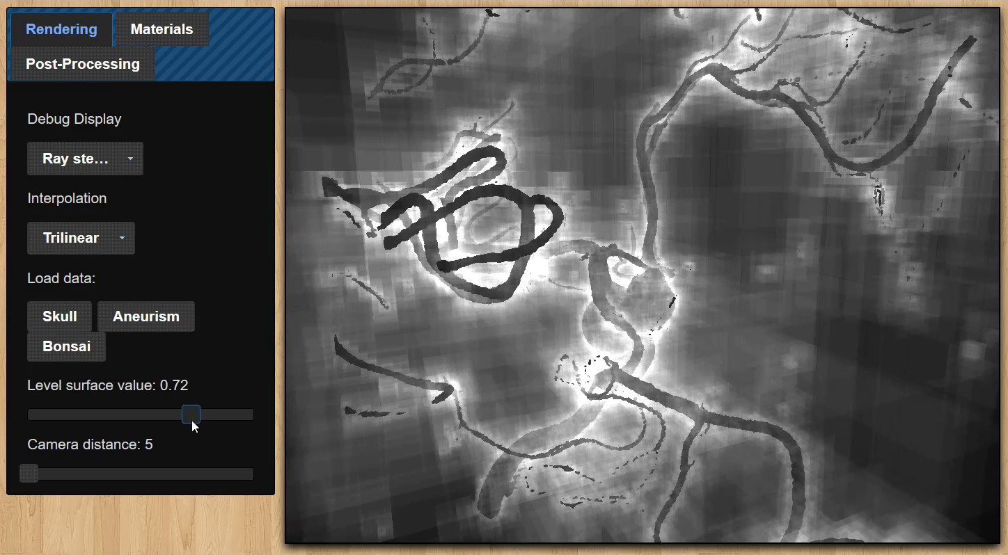 A little experiment that essentially raytraces a level set given a 3D texture (the slices of which are arranged in a grid on a 2D texture). Data can either be loaded from a resource or it can be generated and animated on the fly. Trilinear interpolation is optionally used to smooth the surface, and an octree is dynamically generated to speed up the raytracing. All of the data is stored in textures and all of the work is done by fragment shaders.